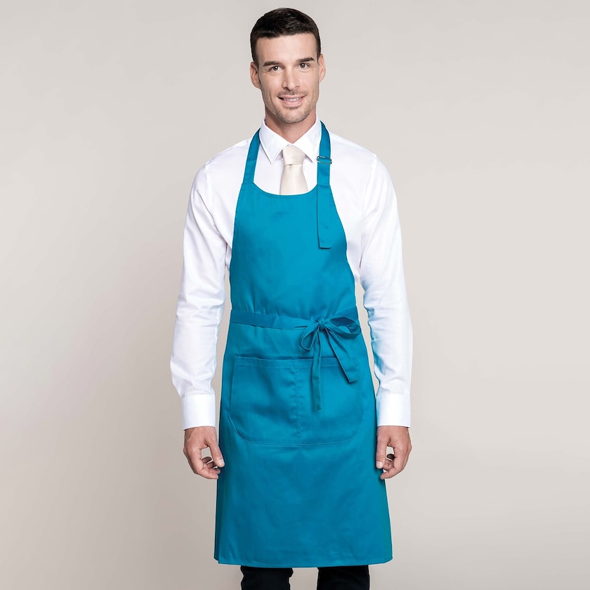 Edullinen esiliina, joka on saatavilla useissa eri väreissä. Materiaalina kestävä polyesterisekoite, joka kestää pesua 60 asteessa. Edessä kaksiosainen tasku. Esiliina on 90 cm pitkä ja 76 cm leveä.