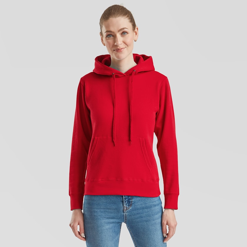 Naisten muotoonommeltu huppari. Lady-Fit Classic Hooded Sweat -huppari on klassinen malli, joka on muutettu vähän naisellisemmaksi. Hupparit toimitetaan muovipusseissa yksittäispakattuina. Saatavilla myös miesten mallina.