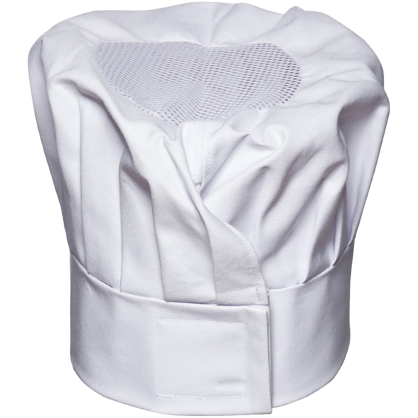 Klassinen kokinhattu. Lakin kokoa voi säätää tarranauhan avulla. Hatun materiaalina on puuvilla ja sen yläosan verkko on polyesteria.