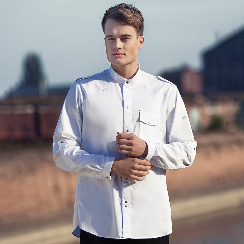 Moderni kokin paita laadukkaasta easy care-kankaasta. Paita suljetaan 5 painonapilla. Vaatteen voi pestä jopa 95 asteessa.