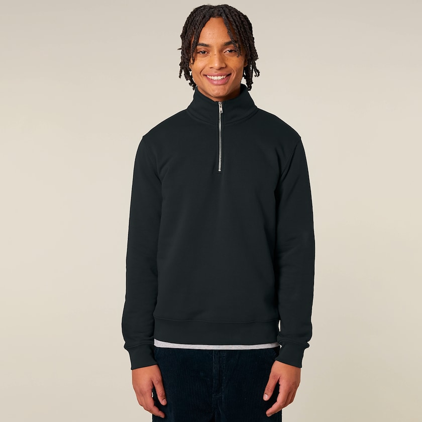 Unisex-mallinen collegepaita, jossa on lyhyt vetoketju kauluksessa. Kangas on valmistettu 85 % luomupuuvillasta ja 15 % kierrätetystä polyesteristä.
