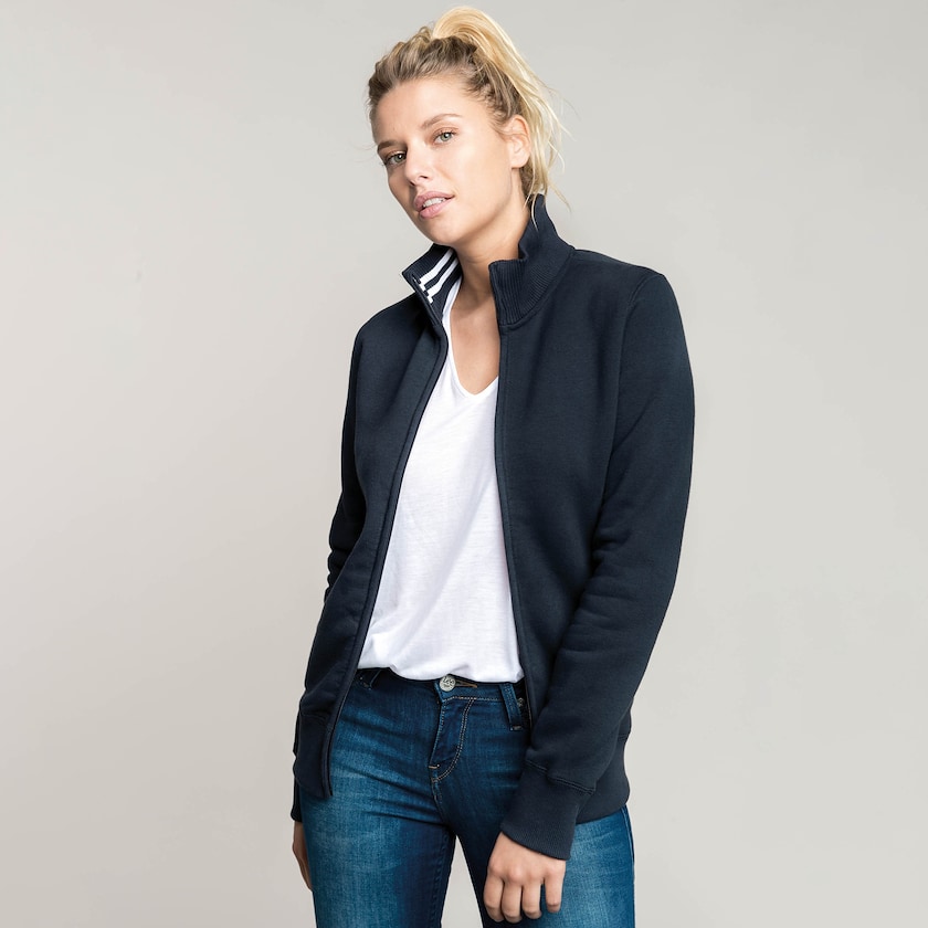 Naisten sporttinen Kariban-paita. Edessä vetoketju ja kauluksessa raidat. Full Zip Women on valmistettu kestävästä, rypistymättömästä kankaasta. Kaksi taskua. Toimitetaan yksittäispakattuina. Saatavilla myös miesten mallina.