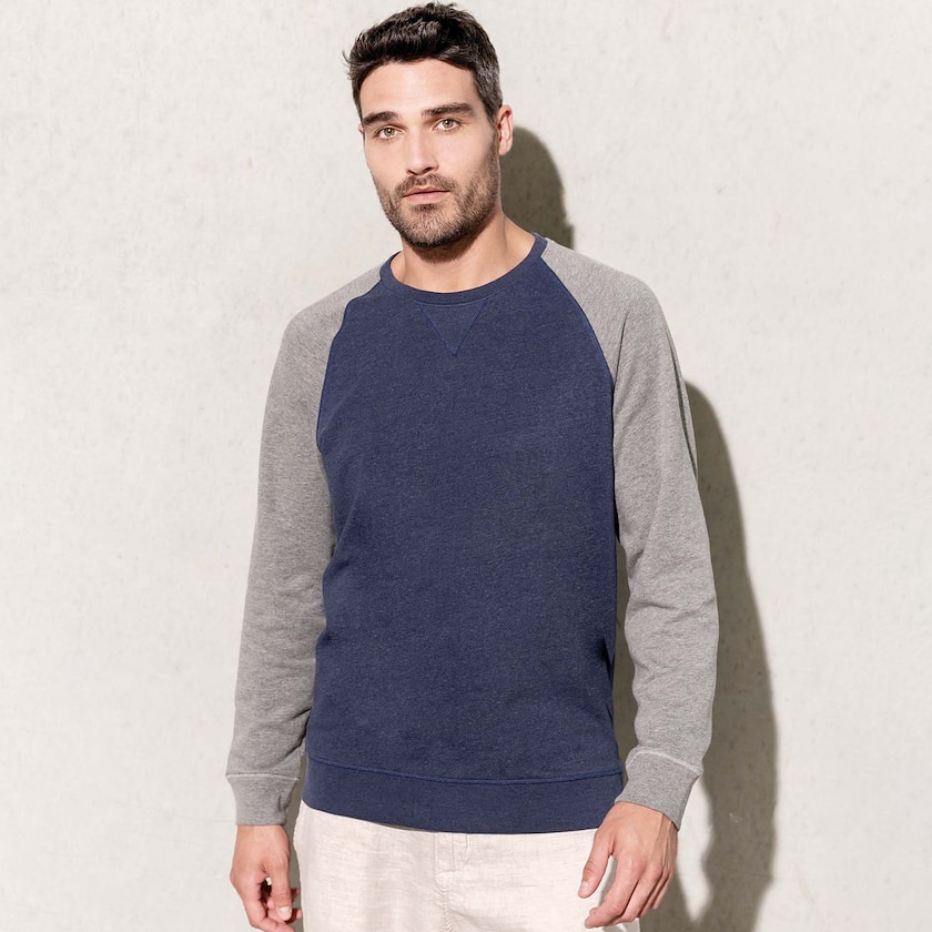 Kaksivärinen pusero sekoitekankaasta. Materiaalina 80% luomupuuvilla ja 20% polyesteri. Saatavilla myös naisten mallina.