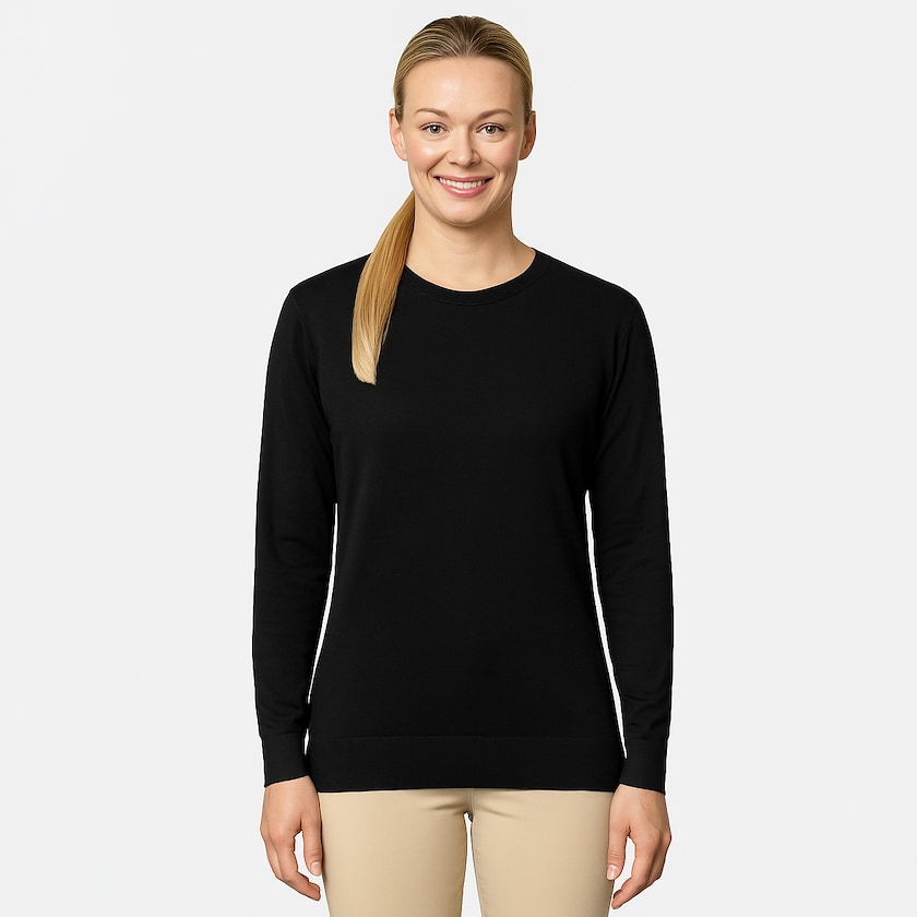 Naisten neulepusero pyöreällä kaula-aukolla. Paidan pehmeä materiaali on 80% viskoosia ja 20% nylonia. Merkkaus tehdään brodeerauksena.