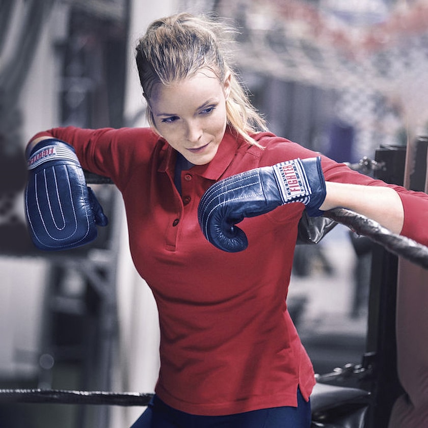 Pitkähihainen naisten pikeepaita puuvillasta. Edessä kolme nappia.