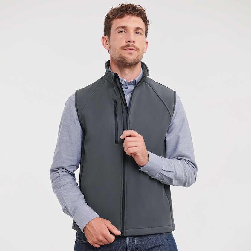 Vartalonmyötäinen 3-kerroksinen softshell-liivi miehille. Liivi on kosteuden- ja tuulenpitävä, sekä hengittävä. Liivin leikkaus on takaa hieman pidempi.