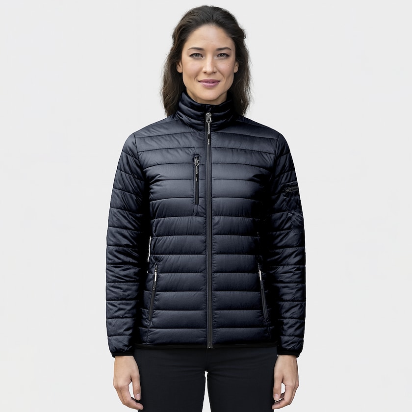 Naisten kevyttoppatakki. Takin kaikissa taskuissa on vetoketju. Takki on vettä hylkivää materiaalia. Toppaus sisältää 90% untuvaa ja 10% höyheniä, minkä vuoksi takki on todella kevyt ja mukava päällä. Brodeeraushinta koskee pienen logon tekemistä takin rintaan. Saatavilla myös miesten mallina.