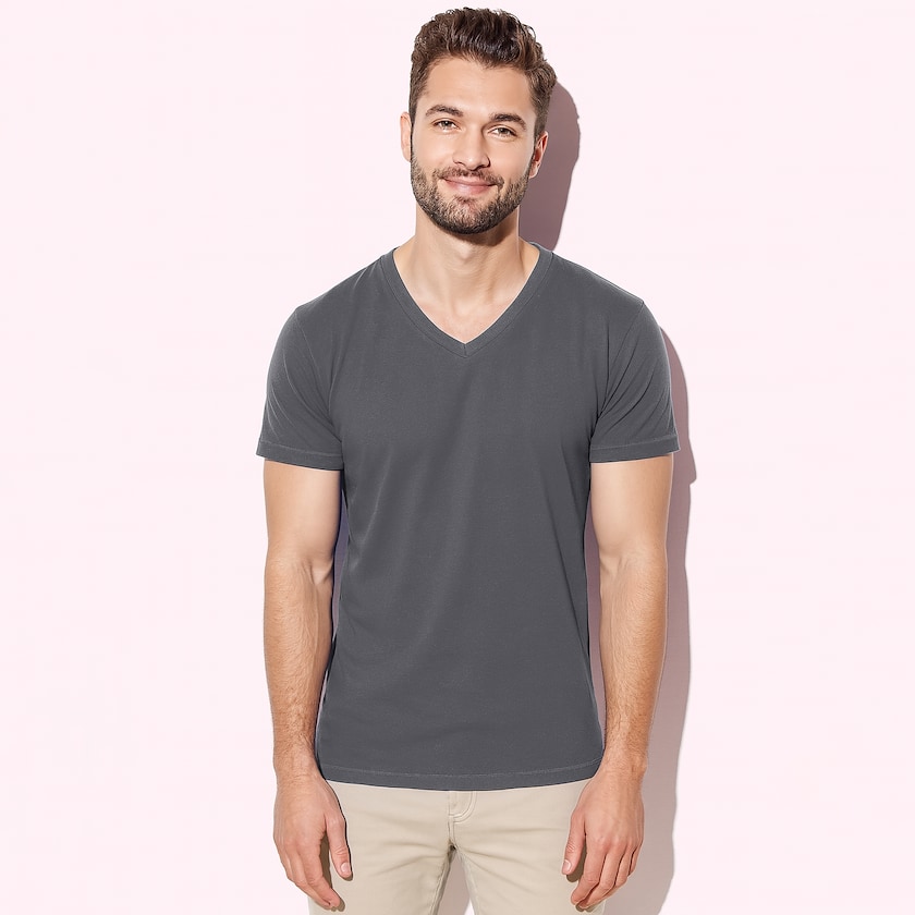 Stedmanin t-paita suurella v-mallisella kaula-aukolla. Paidat toimitetaan yksittäispakattuina muovipusseissa.
