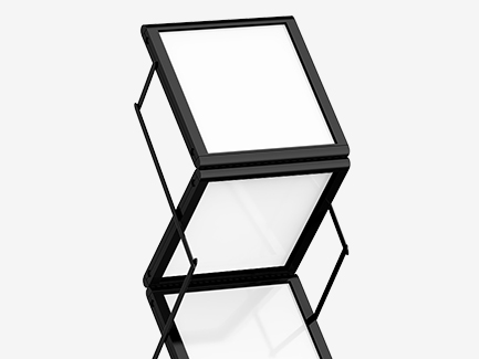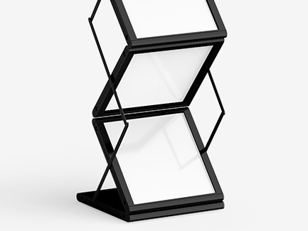 Osa esitetelineistämme toimii sekä esitetelineenä että pöytänä. Tämä on kätevä ratkaisu sinulle, jos messuosastollasi on rajallisesti tilaa tai jos haluat pitää kustannukset kurissa. Näitä malleja on saatavilla sekä A4- että A3-kokoisille esitteille.