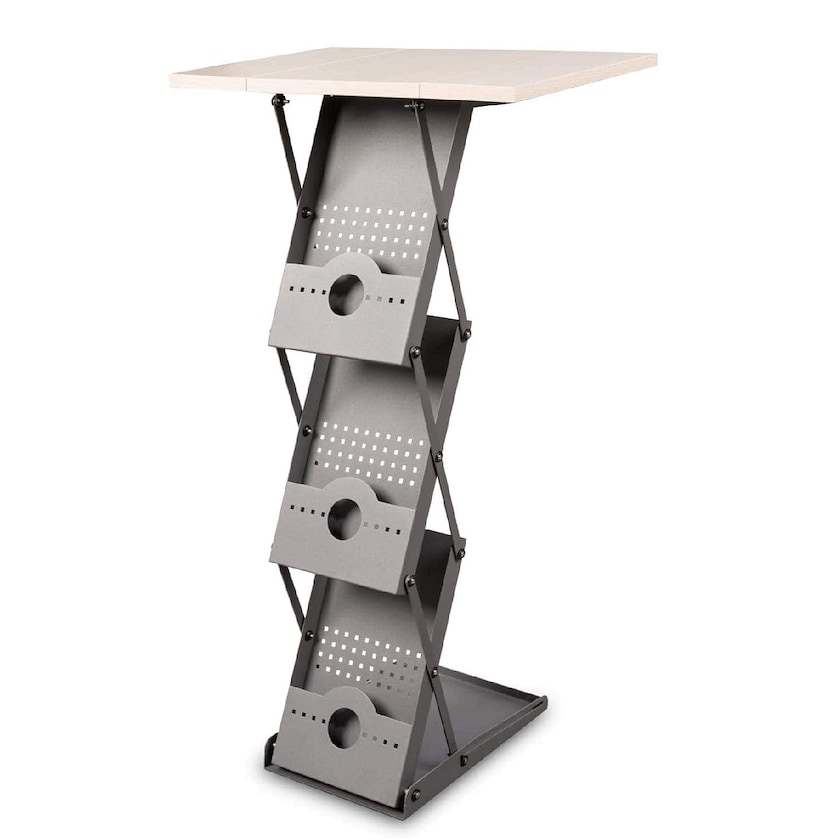 Esiteteline, joka toimii myös messupöytänä. Duo on valmistettu tukevasta metallista ja pöytätaso vaaleasta puusta. Esitetelineessä on kolme lokeroa A4-kokoisille esitteille. Telineen avaaminen ei vaadi kokoamista tai työkaluja. Auki taitettuna esitetelineen korkeus on 101 cm. Käytön jälkeen teline säilytetään mukana tulevassa alumiinilaukussa. 1 vuoden takuu.