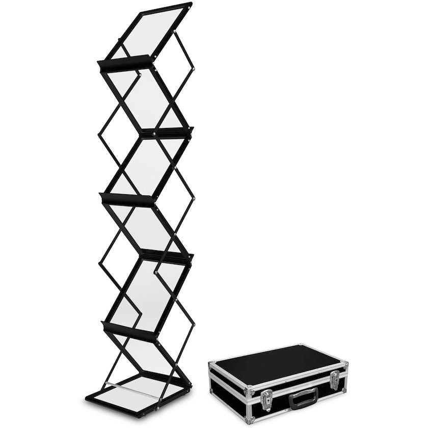 Esiteteline Flex yönmustasta alumiinista tukevalla säilytyslaukulla. Esiteteline on valmistettu mustaksi pulverimaalatusta alumiinista ja varustettu 6 esitelokeroa. Jokainen lokero on kooltaan 30,5 x 22 cm. Auki taitettuna telineen korkeus on 146 cm. Taitettuna mitat ovat 17 x 54 x 47 cm. Asennus on nopeaa eikä vaadi työkaluja. Toimitetaan kestävällä alumiinisella säilytyslaukulla. 1 vuoden takuu.