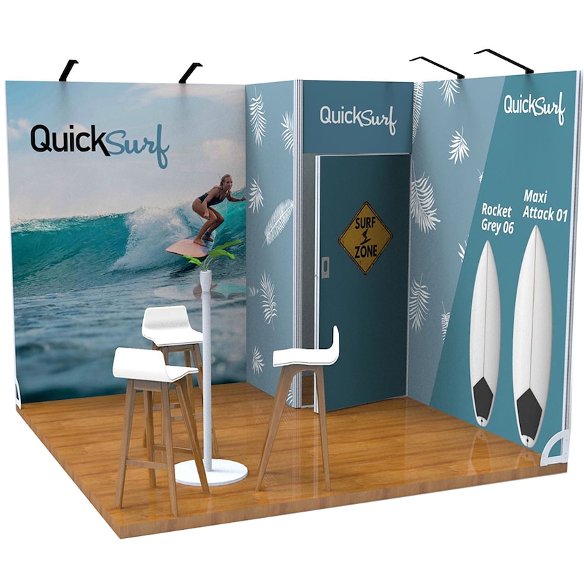 Helposti koottava messuosasto koossa 9 m2. Setti sisältää kaksi 200 cm moduulia, moduulin ovella, kaksi jalkaa ja säilytyspussin. Painatus tehdään kankaalle, joka venytetään moduulien rungon päälle ja kiinnitetään silikoniteipillä. Moduulien rungot on valmistettu anodisoidusta alumiinista. Kaikki osat on merkitty selkeästi nopean kokoamisen mahdollistamiseksi. Asennus ei vaadi muita työkaluja kuin mukana tulevan kuusiokoloavaimen. Jos haluat vaihtaa telineen painatusta, tilaa vain uudet kankaat meiltä. LED-valoja ja TV-tasoja voi ostaa lisävarusteena. Pöytä, tuolit ja lattia eivät sisälly hintaan.