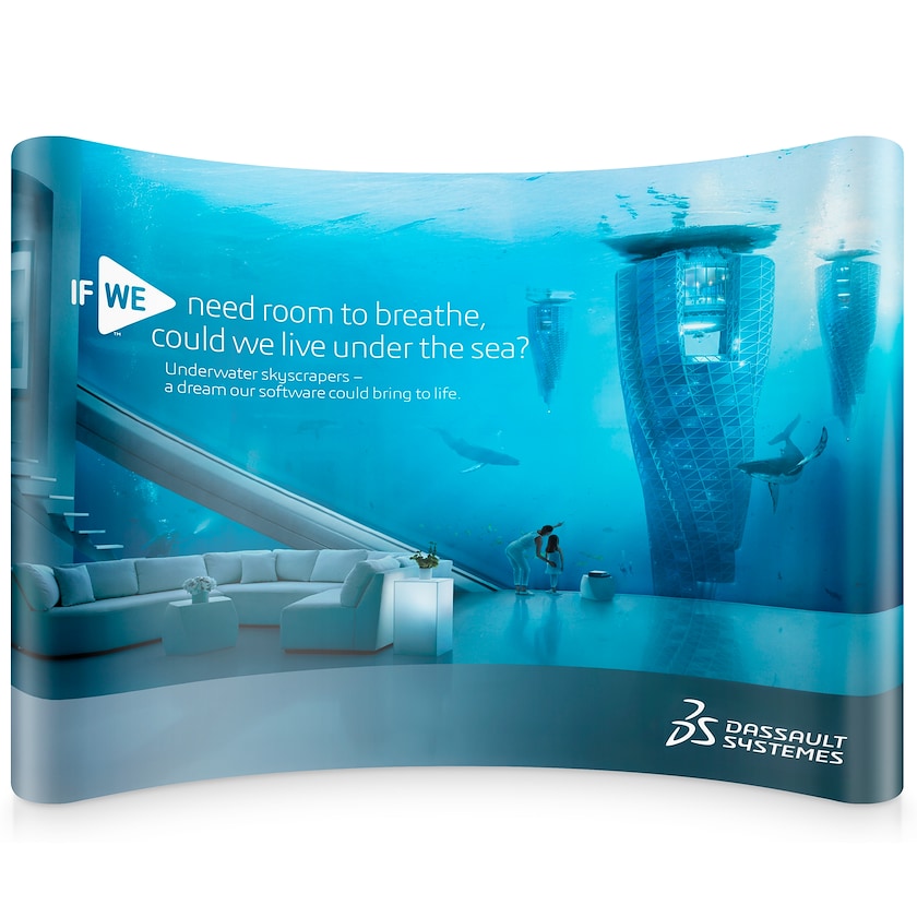 Suuri mainosseinä messuille. Kaarevan seinän voi koota yksin, ja siihen ei tarvita työkaluja. Kangas kiinnitetään paikoilleen magneettinauhan avulla. Tuote toimitetaan pyörällisessä säilytyslaukussa. Painatus tehdään seinän etupuolelle.