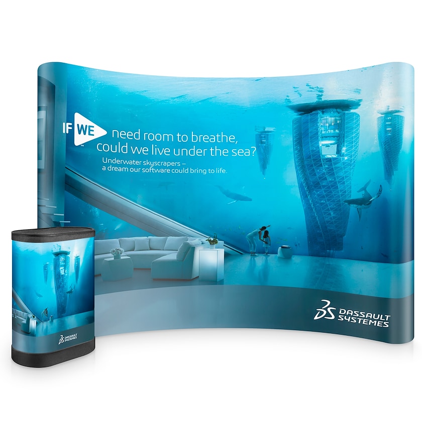 Valokuvapainatuksella kustomoitava seinä ja messupöytä valaistuksineen. Kaareva messuseinä on helppo asentaa, sillä sen saa pystyyn ilman työkaluja. Kangas kiinnitetään paikoilleen magneettinauhojen avulla. Hintaan sisältyy valokuvapainatus sekä seinään että messupöytään. Seinään tehdään painatus sen etupuolelle. Pöytä on varustettu renkailla, ja se toimii myös säilytyslaatikkona.