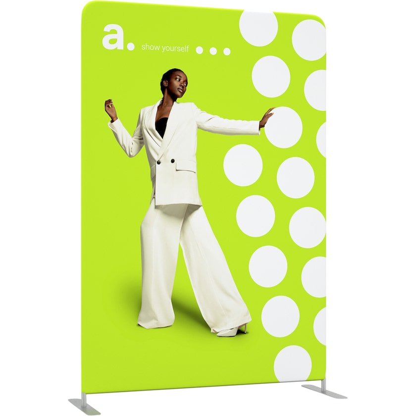150 cm leveä messuseinä painatuksella. Helppokäyttöisen messuseinän sisällä on alumiiniputkista koostuva kehikko, joka kootaan ilman työkaluja. Sen päälle tulee painettu kangas, joka suljetaan vetoketjulla. Kangas kustomoidaan vesipohjaisilla väreillä, ja painatuksen saa seinän molemmille puolille. Kankaan voi pestä 30 asteessa. Jos haluat tulevaisuudessa vaihtaa painatuksen, voit tilata meiltä uuden kankaan. Fiksu ja ympäristöystävällinen valinta!