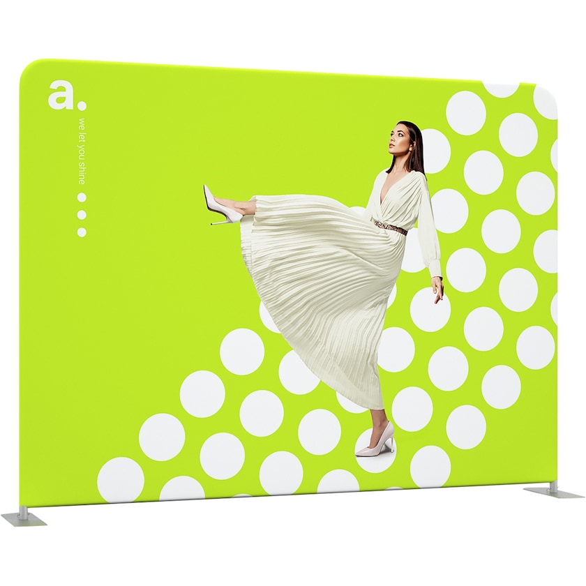 Kevyt ja helposti asennettava messuseinä, jonka leveys on 300 cm. Messuseinä rakentuu alumiiniputkista koottavasta kehikosta, joka on helppo asentaa eikä vaadi työkaluja. Kustomoitu kangas vedetään raamin yli ja suljetaan vetoketjulla. Lopputuloksena on sileä ja rypytön messuseinä. Kankaan voi pestä 30 asteen pesuohjelmassa. Tuotteeseen voi ostaa useita kankaita, jolloin mainosviestin voi halutessaan vaihtaa toiseen. Painatus tehdään vesipohjaisilla väreillä seinän molemmille puolille.