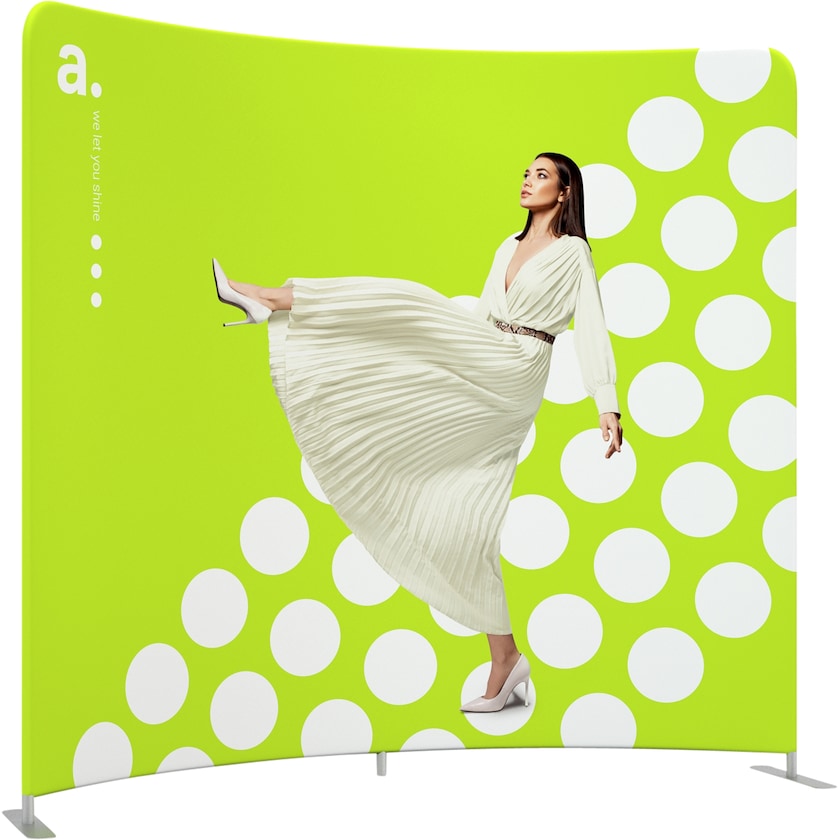 240 cm leveä hieman kaareva messuseinä. Kaartuva muoto luo 3D-tyyppisen vaikutelman. Messuseinä rakentuu alumiiniputkista koottavasta kehikosta, joka on helppo ja nopea koota. Kustomoitu kangas vedetään raamin yli ja suljetaan vetoketjulla. Lopputuloksena on tyylikäs ja kevyt messuseinä. Kankaan voi pestä 30 asteen pesuohjelmassa. Tuotteeseen voi ostaa useita kankaita, jolloin mainosviestin voi tarvittaessa vaihtaa toiseen. Painatus tehdään seinän molemmille puolille vesipohjaisilla väreillä.