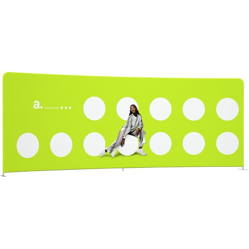 Hieman kaareva messuseinä, jonka leveys on 600 cm. Messuseinän kaartuva muoto luo hieman kolmiulotteisen vaikutelman. Tuote rakentuu alumiiniputkista koottavasta kehikosta, joka on nopea koota ilman työkaluja. Kustomoitu kangas vedetään kehikon yli ja suljetaan vetoketjulla. Lopputuloksena on näyttävä messuseinä. Kankaan voi pestä 30 asteessa. Tuotteeseen voi ostaa tarvittaessa useita kankaita eri mainosviesteillä. Painatus tehdään seinän molemmille puolille vesipohjaisilla painoväreillä.
