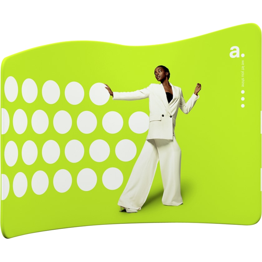 Pehmeästi aaltomainen esittelyseinä, jonka leveys on 300 cm. Pehmeä muotoilu luo kauniin ilmeen messuosastollesi. Messuseinä koostuu alumiiniputkista koottavasta rakenteesta, jonka päälle vedetään painettu kangas. Asennus on nopeaa eikä vaadi työkaluja. Kangas pingoitetaan paikoilleen vetoketjun avulla. Seinän molemmille puolille saa painatuksen vesipohjaisilla väreillä. Jos kangas vaatii pesua, sen voi konepestä 30 asteessa. Haluatko ostaa useita erilaisia kankaita? Se onnistuu, voit tilata meiltä erilaisia painatuksia, jolloin voit vaihtaa ilmettä tarvittaessa. Mukana säilytyskassi.