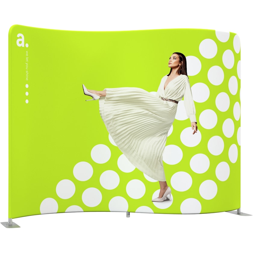 300 cm leveä messuseinä jännittävällä serpentiinimuodolla. Kauniisti kaartuva messuseinä rakentuu alumiiniputkista koottavasta kehikosta, joka on nopea koota ilman työkaluja. Painettu kangas vedetään kehikon yli ja suljetaan vetoketjulla. Lopputuloksena on huomiota herättävä messuseinä. Kankaan voi pestä 30 asteessa. Tuotteeseen voi ostaa tarvittaessa useita kankaita eri tarkoituksiin tai tilaisuuksiin. Painatus tehdään seinän molemmille puolille vesipohjaisilla painoväreillä.