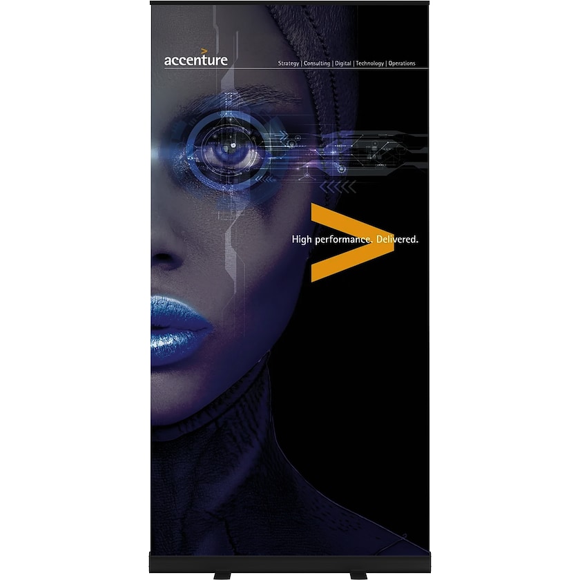 100 cm leveä roll up mustana versiona. Rakenne on valmistettu pulverimaalatusta mustasta anodisoidusta alumiinista. Roll upin kangas on Blockout PET 330 g/m² -materiaalia, joka on huippuluokan kangas pehmeällä mattapinnalla. Se estää valon läpipääsyn ja takaa erinomaisen värintoiston. Painatus tehdään digitaalisesti edistyneellä UV LED teknologialla ja Euroopassa valmistetuilla ekologisilla väreillä. Kankaan mitat ovat 200 x 100 cm. Mukana toimitetaan käytännöllinen kantolaukku. 1 vuoden takuu. Roll up on muuten identtinen Standard-mallin kanssa, mutta väriltään musta.