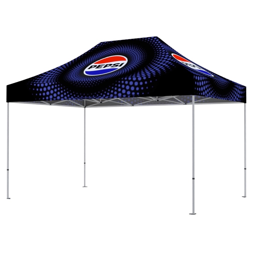 3 x 4,5 metrin tapahtumateltta painatuksella. Tapahtumateltta Pro 3 x 4,5 toimitetaan telttarungon, kattokankaan, kiinnitysnarujen, telttapiikkien sekä pyörillä varustetun säilytyslaukun kanssa. Lisäksi voit valita useista eri seinävaihtoehdoista, joita on saatavana painatuksella tai ilman painatusta. Jopa kattokangas on saatavana painatuksella tai ilman. Telttarunko on valmistettu kestävästä alumiinista, ja siinä on tukevat, 40 mm halkaisijaltaan olevat kuusikulmaiset jalat. Teltta kestää tuulennopeuksia jopa 29 km/h asti. Lisäpainoilla saat tarvittaessa lisää vakautta. Kangas on vedenpitävä, joten teltta sopii sekä sisä- että ulkokäyttöön. Korkeus on säädettävä. Nopea kokoaminen vain 20–30 minuutissa.