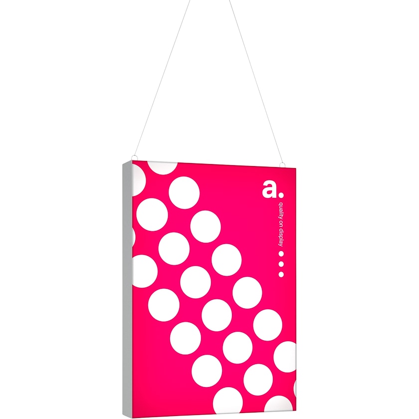 Pieni valotaulu, joka roikkuu katosta. Valolaatikko on valaistu huippumodernilla LED-valojärjestelmällä, joka valaisee taatusti koko painatuksen. Design painatetaan polyesterikankaalle erikoiskehitetyllä painomenetelmällä, joka varmistaa terävät yksityiskohdat ja selkeät värit. Painatus sijoitetaan valotaulun molemmille puolille. Kun on aika vaihtaa painatusta, tilaat vain meiltä uuden kankaan. Asennus on nopeaa ja helppoa.
