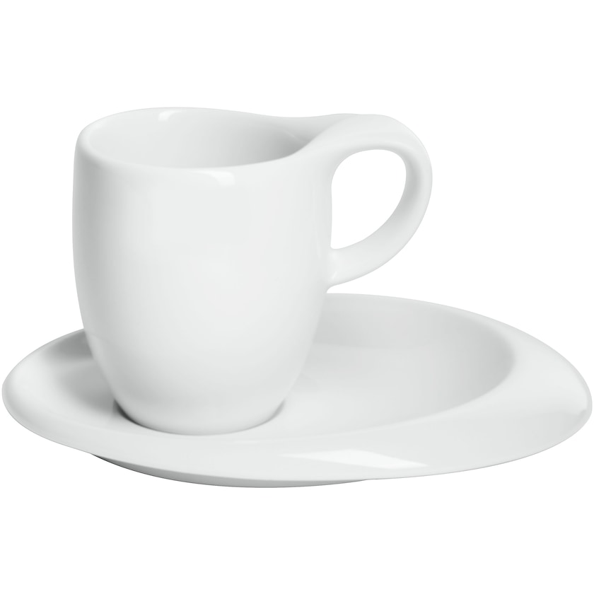 Ylellinen espressokuppi ja asetti. Setti on valmistettu kiiltävästä posliinista. Sekä asetti että kuppi ovat muotoilultaan pehmeän pyöreälinjaisia. Suurelle asetille mahtuu mainiosti myös keksi tai suklaakonvehti.