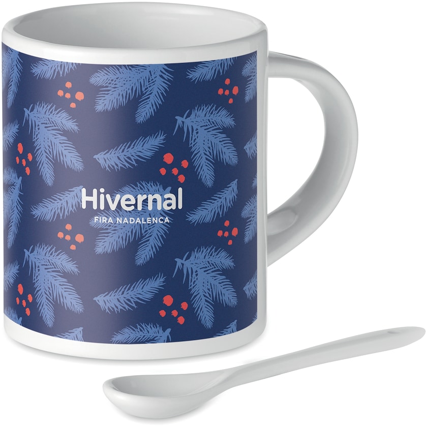 Valokuvamuki lusikalla. Mukissa on suuri painoala, joka mahdollistaa vaikuttavan mainosviestin. Lusikka pysyy tallessa mukin korvassa.