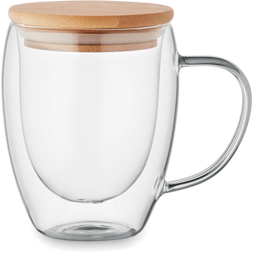 Lasimuki kaksinkertaisella seinämillä ja bambukannella. Kaksoisseinämien ansiosta juoma pysyy lämpimänä pidempään. Painatus voidaan tehdä enintään kahdella värillä.