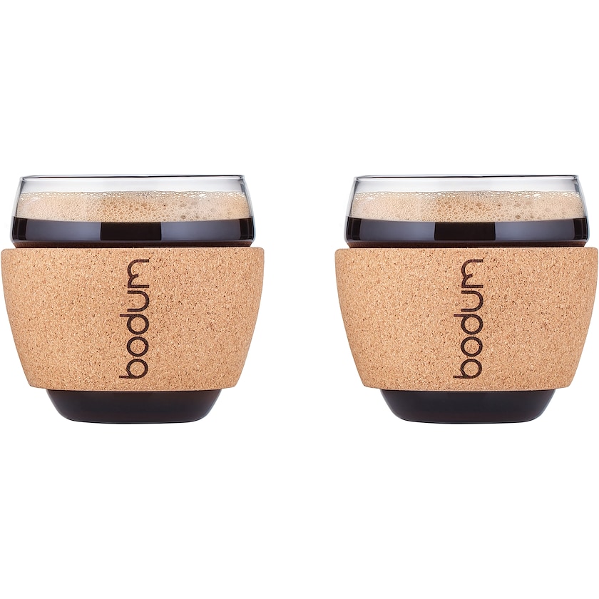 Setti, joka sisältää kaksi 35 cl lasimukia merkiltä Bodum. Mukien ympärillä on korkkisuojus. Laserkaiverrushinta koskee yhden mukin kustomointia.