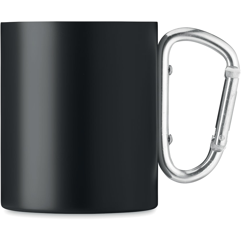 Ruostumattomasta teräksestä valmistettu muki, jossa karabiini kahvana. Mukissa on tuplaseinämät, joten kuumat juomat pysyvät lämpimänä pidempään.