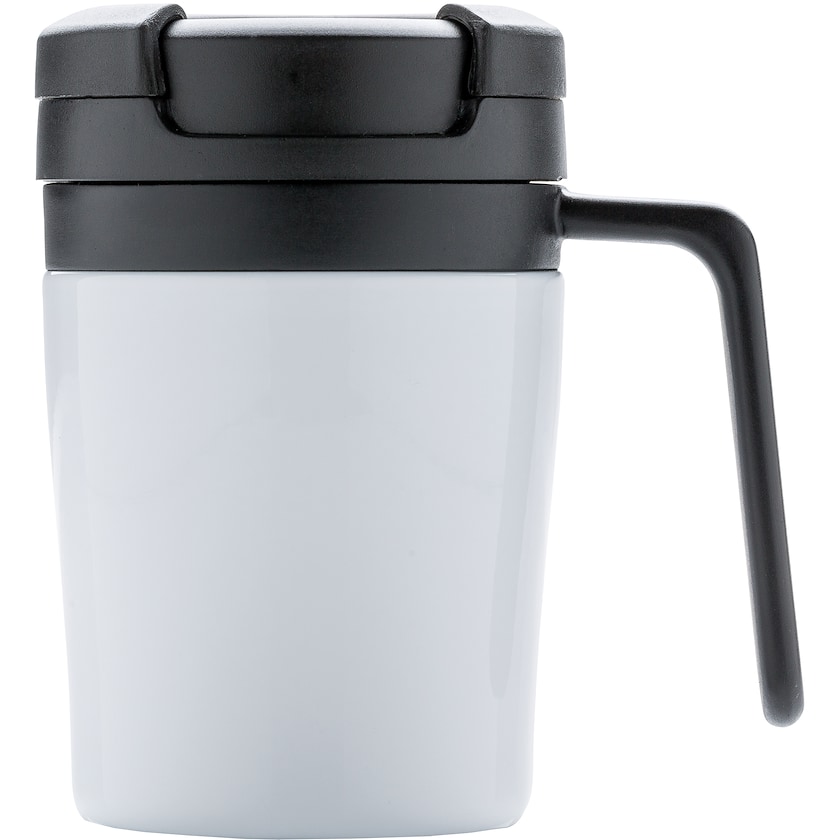 Pieni 16 cl metallimuki kahvalla. Tuplaseinäinen muki, jonka ulkopuoli on metallia ja sisäpuoli PP-muovia. Vain 8 cm korkea muki sopii useimpiin kahvikoneisiin. Vain käsintiskaus. Toimitetaan kartonkilaatikossa. Rekisteröity design®