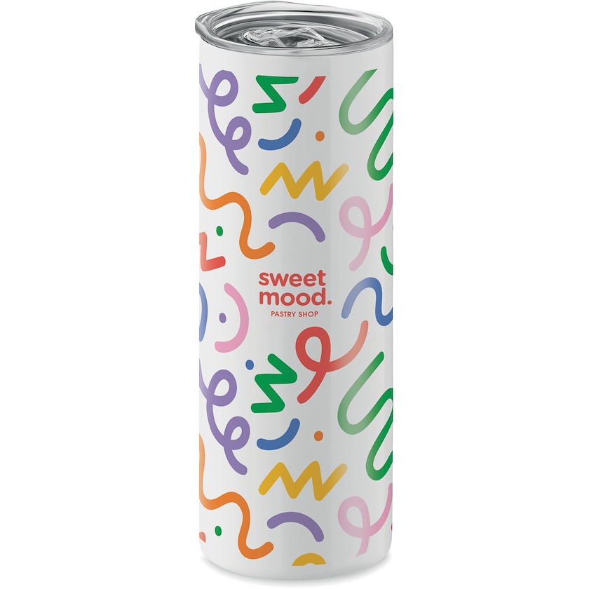 Valkoinen metallimuki, jonka koko alalle saa oman painatuksen. High Hill on valmistettu ruostumattomasta teräksestä. Kaksinkertaisen ja eristävän rakenteensa ansiosta se pitää juomat lämpiminä tai viileinä pitkään.