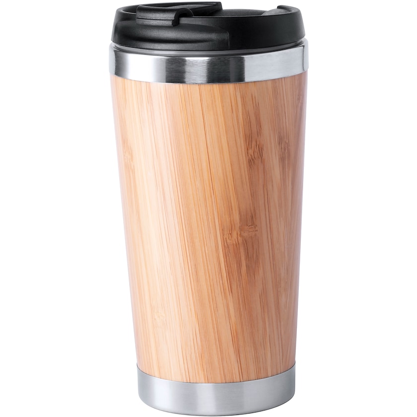 Ruostumattomasta teräksestä valmistettu matkamuki, joka ulkopinta on aitoa bambua. 45 cl muki toimitetaan kartonkilaatikossa. Merkkaus vain laserkaiverruksena.
