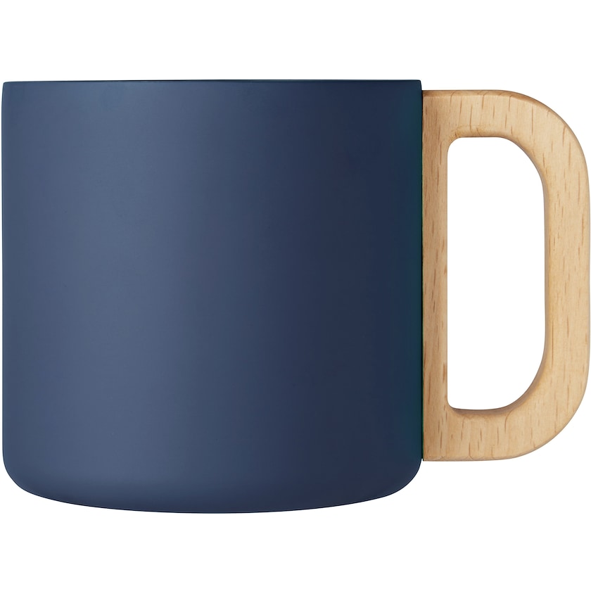Kierrätetystä ruostumattomasta teräksestä valmistettu metallimuki. Muki on tyhjiöeristetty, joten se pitää kuumat juomat lämpiminä pidempään. Kahva on valmistettu pyökkipuusta.