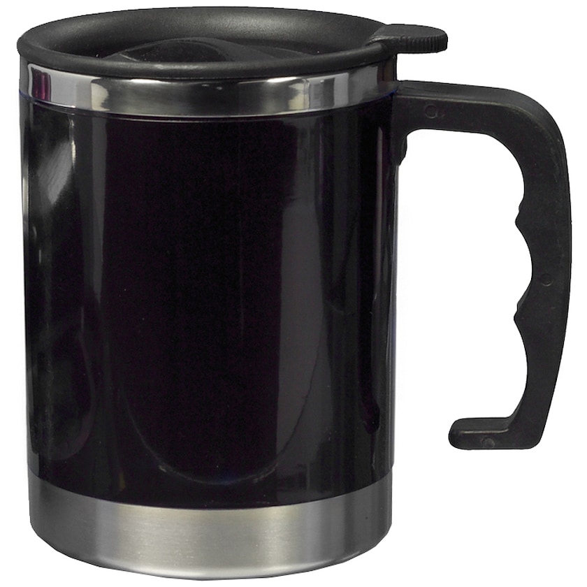 Kestävä muki muovista ja metallista. Mukana kansi.