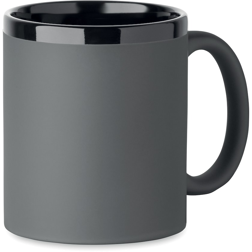 Muki soft-touch-pinnalla, mustalla sisäpinnalla ja reunalla. Merkkaus tehdään laserkaiverruksella, joka näkyy mustana. Toimitetaan yksittäin valkoisissa pahvilaatikoissa pakattuina.