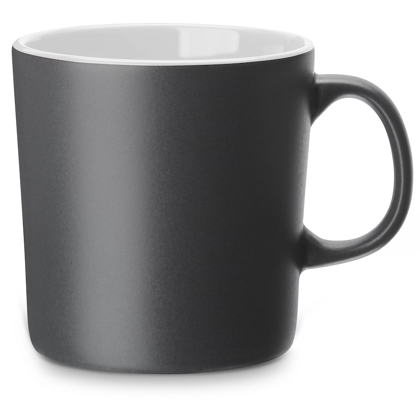 Harmaa muki, jossa on värillinen sisäpinta. Harmaa mattapintainen muki on tilavuudeltaan 25 cl. Sisäpuoli on kiiltävä.