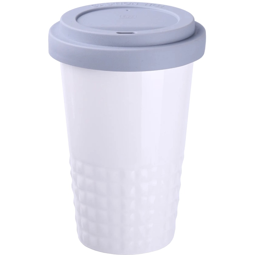 Kauniisti muotoiltu take away-muki posliinista. Mukissa on kaksinkertaiset seinät sekä kuminen kansi, joten se pitää juomasi lämpimänä pitkään.