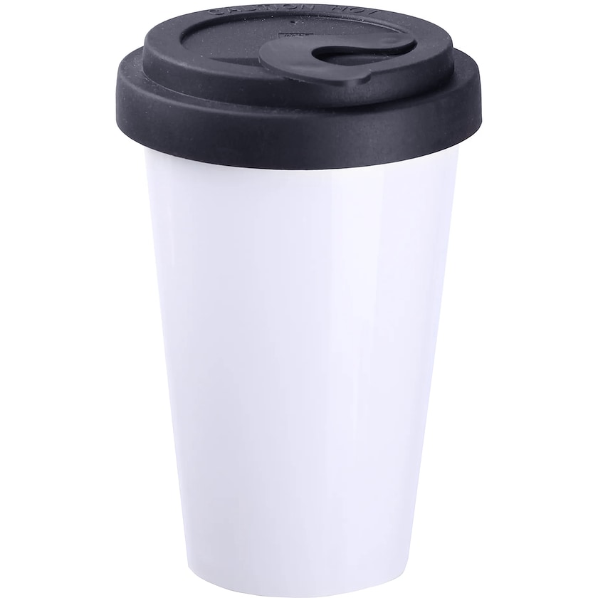 Posliinimuki, jonka kumikannessa on uniikki läikkymisen estävä läppä. Mukissa on kaksinkertaiset seinät, minkä ansiosta se pitää juomat lämpiminä pitkään.