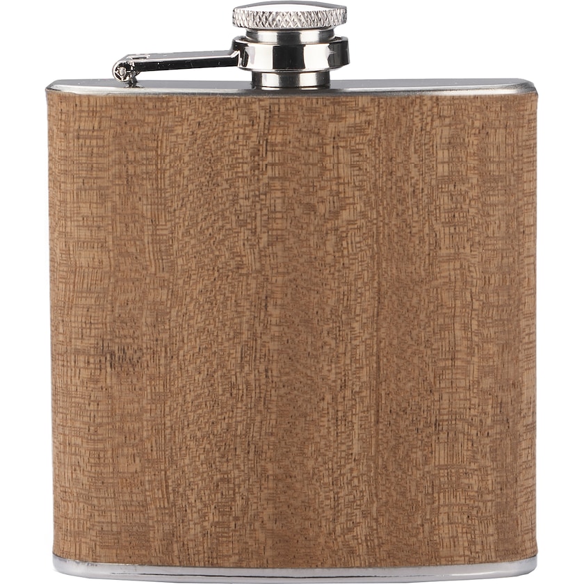 Teräksinen taskumatti, jonka ulkopinta on puuta. Tilavuus 20 cl. Kauniin taskumatin voi kustomoida painatuksella tai laserkaiverruksella.