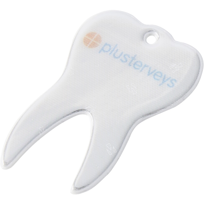 Hampaan muotoinen pehmoheijastin. Sopii hyvin hammaslääkäreille! Mukana joko metallilenkki tai hakaneula ja lanka. Heijastinmateriaali on EN13356:2001-vaatimusten mukainen. Painatus tehdään heijastinpinnan alle, jotta se ei vahingoita pintaa.