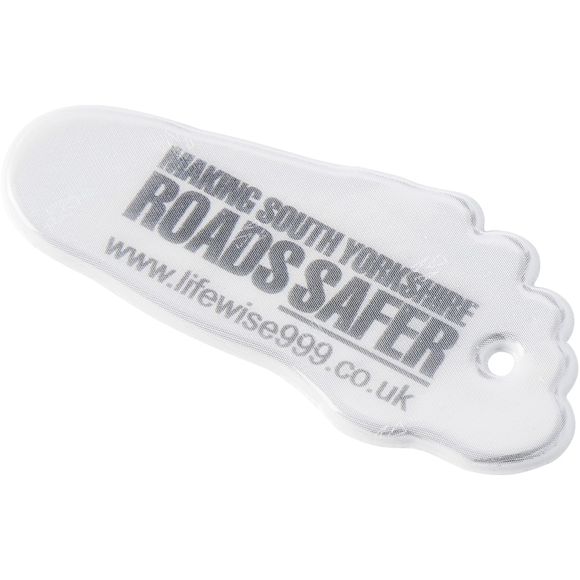Hauska jalan muotoinen pehmoheijastin. Mukana lanka ja hakaneula tai metallilenkki. Heijastinmateriaali on EN13356:2001-vaatimusten mukainen. Painatus tehdään heijastinpinnan alle.