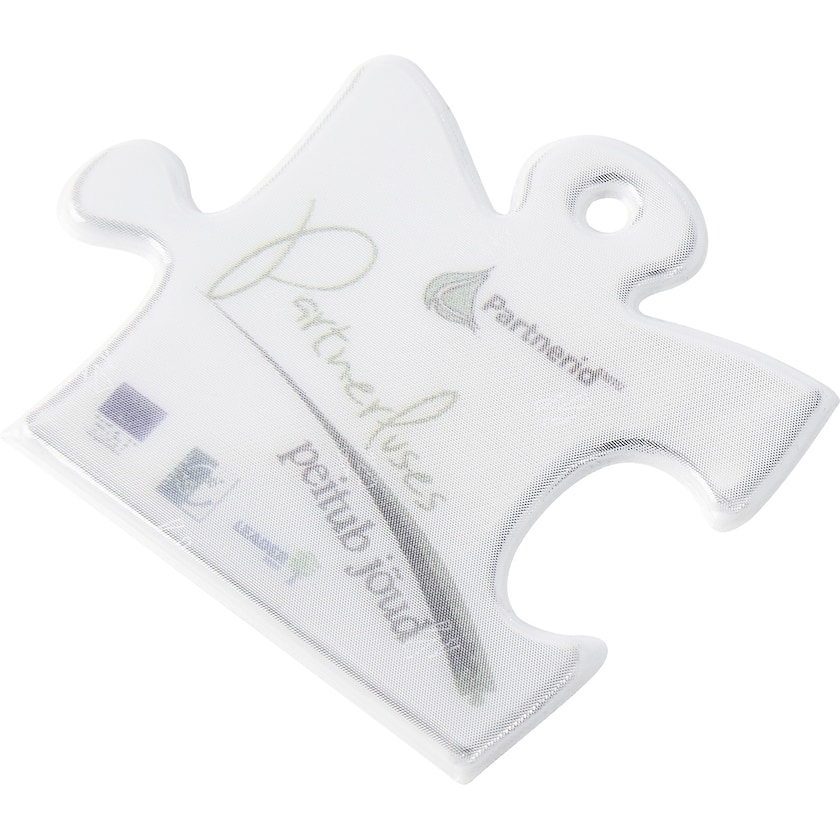 Hauska pehmoheijastin, joka palapelin palan muotoinen. Pehmeä heijastin Jigsaw toimitetaan joko narulla ja hakaneulalla tai kuulaketjulla. Heijastinmateriaalia on saatavana valkoisena tai keltaisena, ja se täyttää standardin EN13356:2001 vaatimukset. Painatus tehdään heijastinpinnan alle.