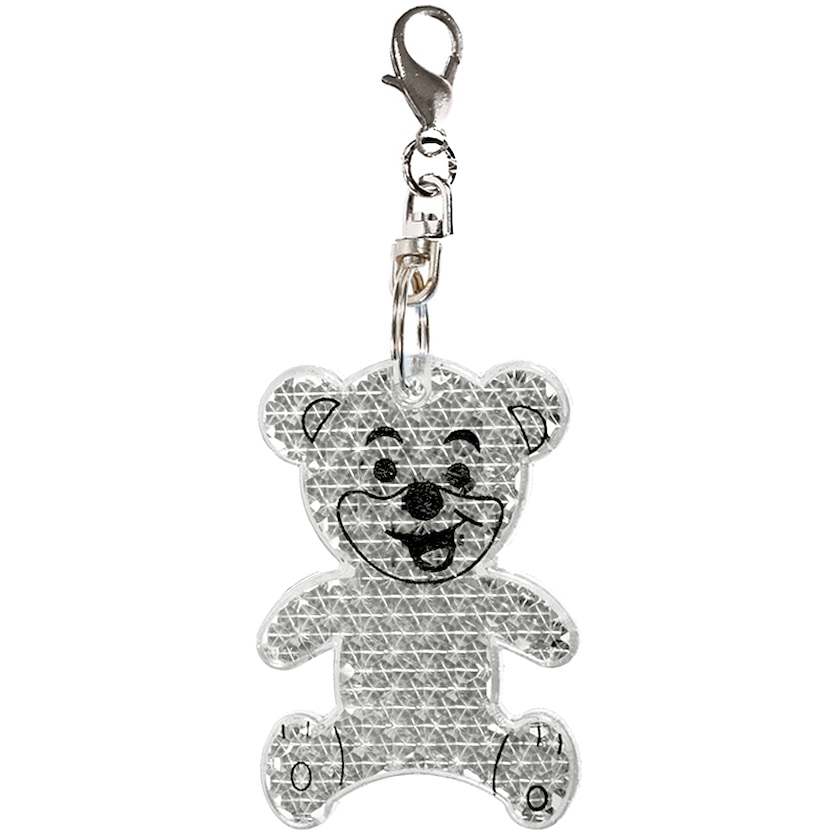 Nallekarhun muotoinen kova heijastin. Heijastimessa on karbiinihaka, jonka avulla se on helppo kiinnittää esim. reppuun roikkumaan.