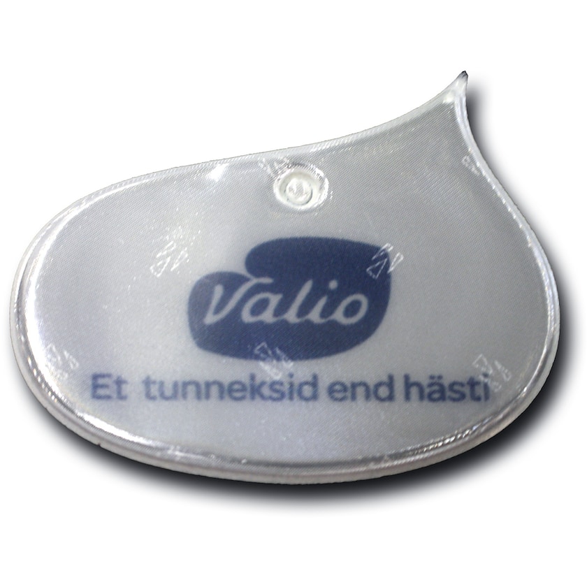 Kiva heijastin, joka on puhekuplan muotoinen. Mukana joko metallilenkki tai hakaneula ja lanka. Heijastinmateriaali on EN13356:2001-vaatimusten mukainen. Painatus tehdään heijastinpinnan alle, jotta se ei vahingoita pintaa.