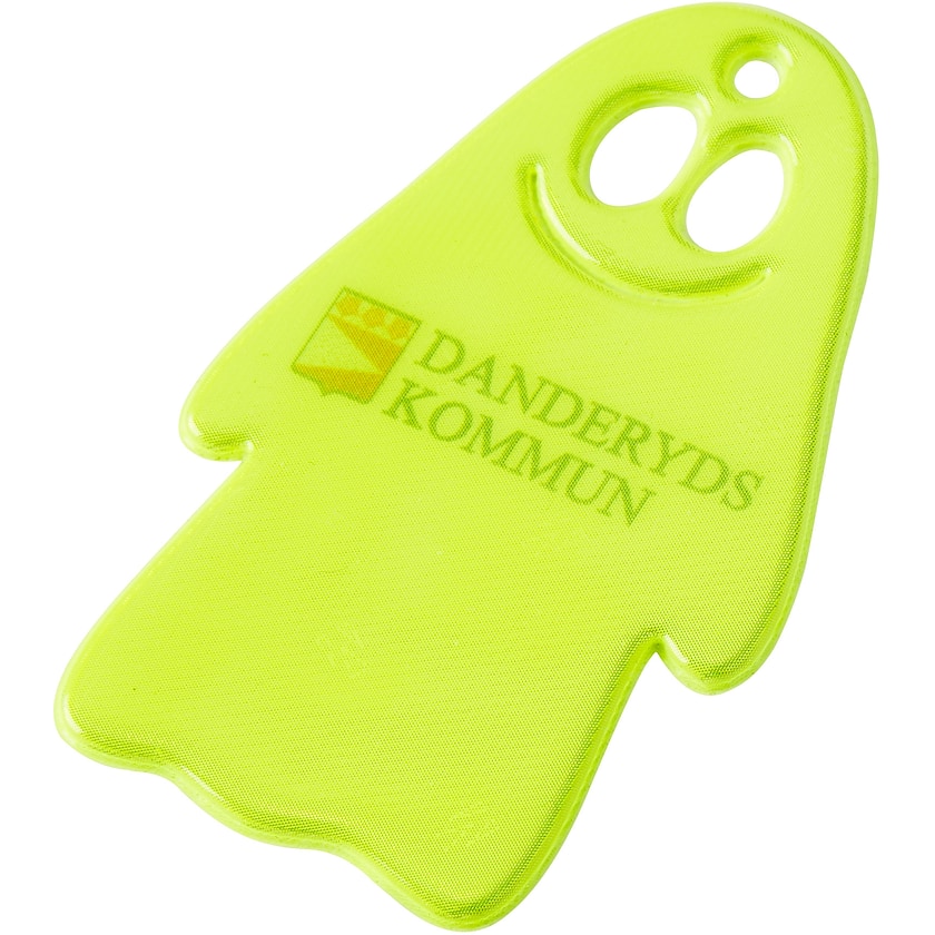 Karmivaa! Hymyilevä haamu -pehmoheijastin. Heijastin toimitetaan narulla ja hakaneulalla tai metallisella kuulaketjulla. Voit itse valita, haluatko valkoisen vai keltaisen heijastinmateriaalin. Heijastinmateriaali täyttää standardin EN13356:2001 vaatimukset. Jotta heijastusteho ei heikkenisi, painatus tehdään heijastinpinnan alle.