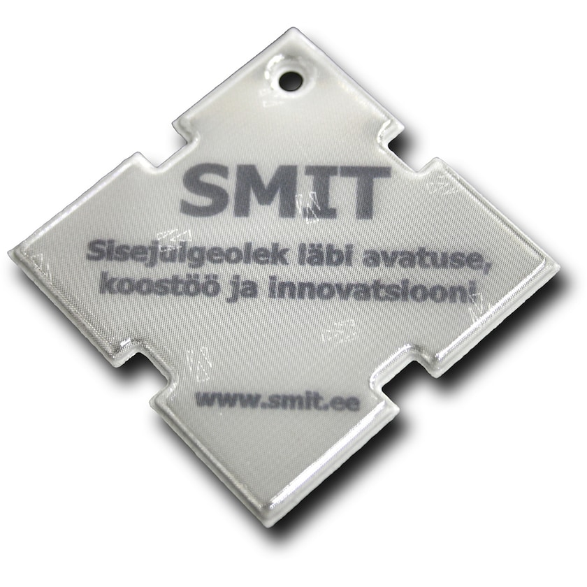 Kulmikas heijastin pehmeästä heijastinmateriaalista. Pehmeä heijastin Systemilla on ainutlaatuinen muoto, joka tuo mieleen tekniikan ja teollisuuden. Mukana joko metallilenkki tai hakaneula ja lanka. Heijastinmateriaali tulee 3M Scotchlitelta ja on EN13356:2001-vaatimusten mukainen. Painatus tehdään heijastinpinnan alle, jotta se ei vahingoita pintaa.