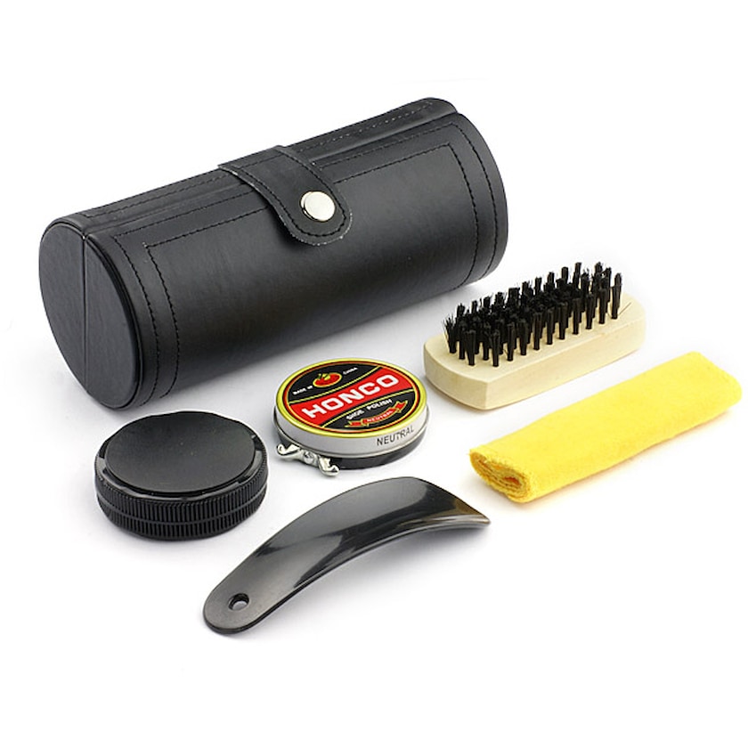 Kengänhoitopaketti sisältää kenkärasvan, kenkälusikan, harjan ja sienen. Painatus tehdään kaivertamalla pakkaukseen.